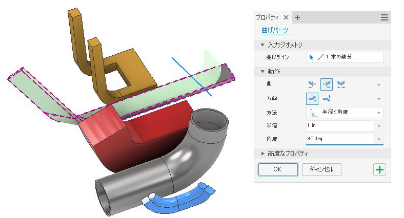 [曲げ]コマンドの詳細については、「パーツを曲げるには」を参照してください。