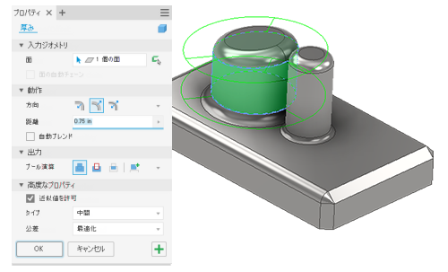 [厚み/オフセット]コマンドの詳細については、「面に厚みを付けたり、サーフェスをオフセットするには」を参照してください。