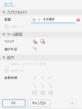 [チューブ&パイプ]の[ルート]コマンドと[派生ルート]コマンドは、プロパティ パネル UI を使用します。