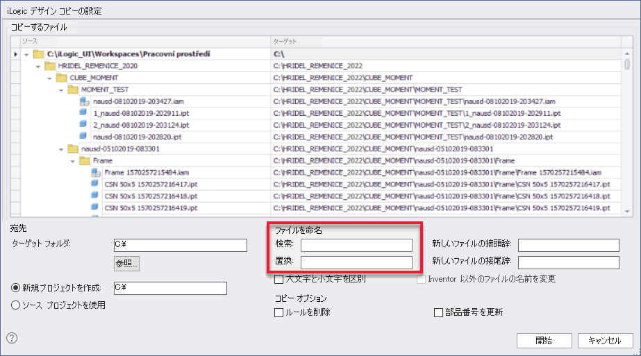 iLogic デザイン コピー ダイアログで新しく追加された検索および置換編集フィールドを使用して、ファイル名を変更できるようになりました。