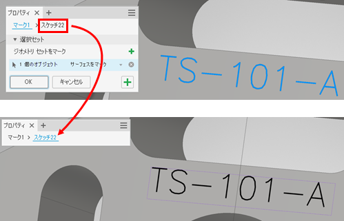 マーク フィーチャ プロパティ パネルの階層リンクが更新され、スケッチが追加されます。これにより、コマンドを終了せずにスケッチを編集できるようになります。階層リンクで[スケッチ]をクリックするだけで、スケッチが編集用にアクティブになります。