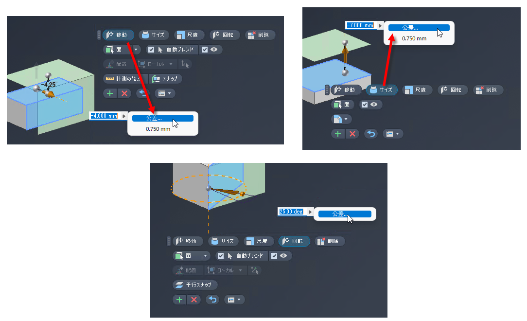 [移動]、[サイズ]、[回転]の右クリック メニューにオプションが追加されたため、フィーチャを直接編集する際に許容差を設定できるようになりました。