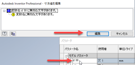 パラメータ名が無効な場合(スペースやカンマを使用するなど)、警告ダイアログに[編集]ボタンが表示され、名前を直接修正できるようになりました。以前は、編集を破棄してもう一度始めることしかできませんでした。