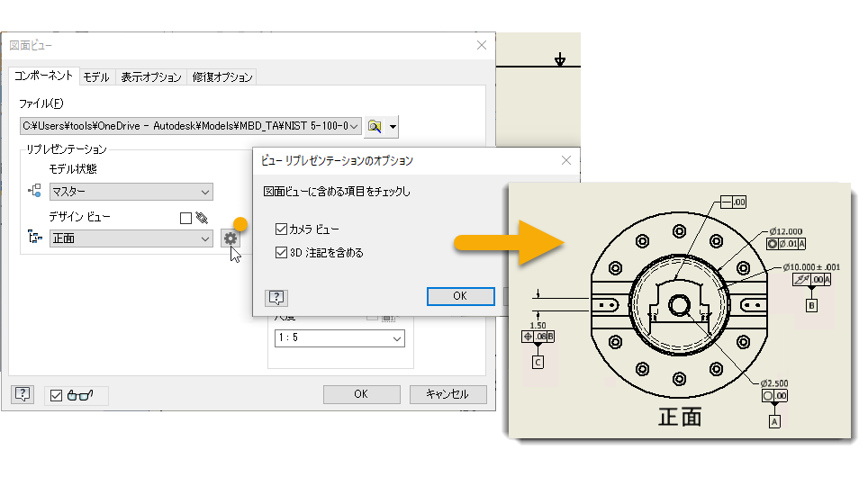 投影ビューの 3D 注記を抽出するには、ビュー内をダブルクリックしてビューの編集をアクティブにし、[ビュー設定]で[3D 注記を含める]をオンにします。