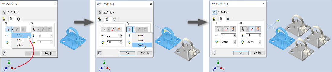 基準軸を使用したパターンの作成を迅速化するため、軸をパターン ダイアログで使用できるようになりました。セレクタをクリックして、軸 フライアウトにアクセスします。