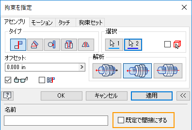 既定では、軸拘束を作成する場合、Inventor は拘束の作成に最適なソリューションを予測しようとします。新しい設定である[既定で間接にする]を使用すると、既定で間接であった従来の動作に永続的に戻すことができます。