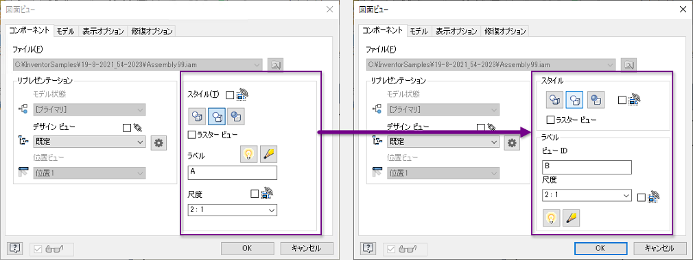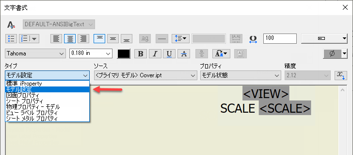 新しい[モデル設定]カテゴリが[文字書式]ダイアログの[タイプ]コンボボックスに追加され、図面ビューにモデル状態名を表示するようにビュー ラベルを設定できるようになりました。ビューのモデル状態に対する編集内容は、ビュー ラベルに反映されます。