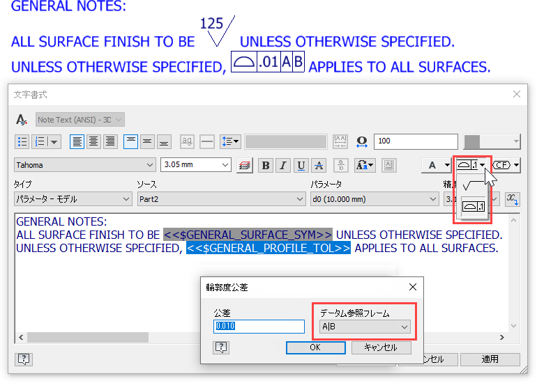 詳細については、「幾何公差記号注記および幾何公差アドバイザを使用するには」を参照してください。