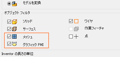 SolidWorks メッシュ データをインポートできるようになりました。ダイアログの[オブジェクト フィルタ]セクションで、[メッシュ]オプションをオンにして、選択したファイルからメッシュを組み込みます。メッシュデータを使用した作業の詳細については、「メッシュ ジオメトリの使用の概要」を参照してください。