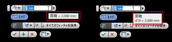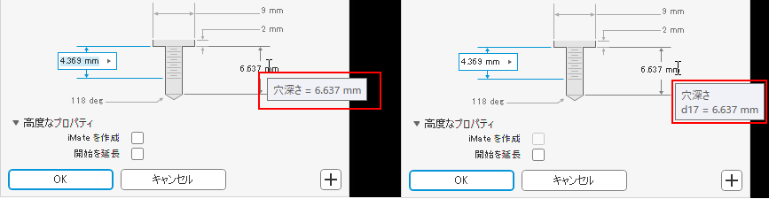 [穴]コマンドの場合、指定されたねじの長さが穴深さより大きいなど、値が無効の場合、値の色は赤に変わり、値を入力しているときに、その値が無効であることがツールチップで通知されます。これにより、すぐにその値を修正するか、またはこの値を有効にするために編集が必要な別の値を特定できます。値が有効な場合、値の色は黒になります。