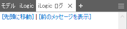 | パネルからメッセージを消去すると、古いメッセージが利用可能な場合には、ナビゲーション リンクがパネルの上部に表示されます。 | [iLogic ログ]パネルで一度に表示できるメッセージの上限は、20,000 件です。20,000 件を超えるメッセージが入力された場合は、パネルの下部にあるナビゲーション リンクを使用して、20,000 件の上限に達した後に作成されたメッセージにアクセスできます。 |