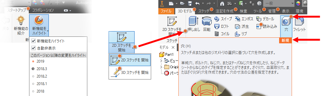 ([新しい穴を作成])をクリックしたときに未使用のスケッチの中心点が存在する場合、[穴]コマンドの使用時に、次の穴の作成に使用するためにスケッチが自動的に共有されます。次の穴にスケッチを使用しない場合、または[キャンセル]をクリックするか[Esc]を押した場合、スケッチは共有されません。スケッチを手動で共有するには、スケッチ ブラウザ ノードを右クリックして、[スケッチを共有]をクリックします。 [スケッチを自動的に共有]は、パーツ環境でのみ使用できます。