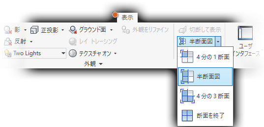 Inventor をインストールするときには、データ収集アクティビティへの参加を選択できます。Inventor の使用状況データに基づき、パーツおよびアセンブリ モデルでは半断面図が最もよく使用されることがわかりました。したがって、この更新により、Inventor セッションで初めて使用する場合の断面図コマンドの既定値が[半断面図]になります。このツールの適切な設定の特定にご協力いただき、ありがとうございました。 断面図コマンドには、パーツ ドキュメントとアセンブリ ドキュメントの[表示]タブと[注釈]タブの両方からアクセスできます。
