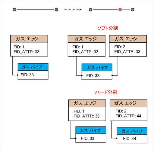 ジオメトリと属性は別に保存されるため、1 つのジオメトリ フィーチャ クラス(ポイントなど)が、さまざまの属性フィーチャ クラス(アーマチャ(電機子)、継手など)を参照できます。ライン フィーチャでは、ソフト分割とハード分割という、2 つの異なるライン分割方法があります。