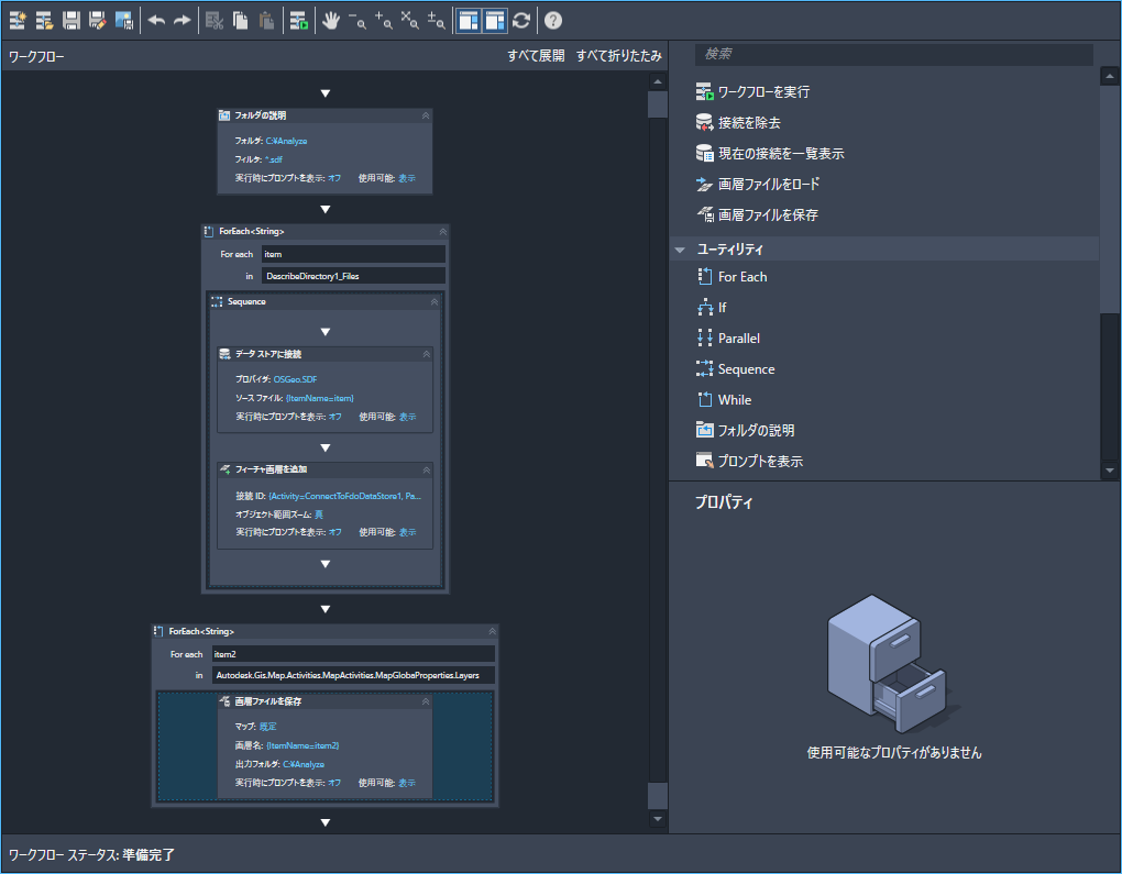 LoopAddLayers は、ForEachアクティビティで、指定のアクションを特定のアイテムのコレクションに対して繰り返し実行します。このタイプのアクティビティは、[ユーティリティ]ツールボックスにあります。