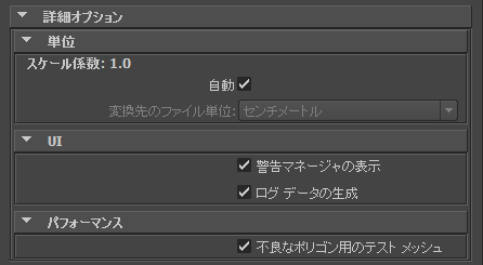 - つまり、変換先のファイル単位(File Units Converted To)オプションをファイル単位(File Units)に一致させることができます。この設定により、スケール係数(Scale Factor)は「1.0」になり、ファイルと Maya のシステム単位(System Units)が一致していない状態でも、スケーリングは適用されません。