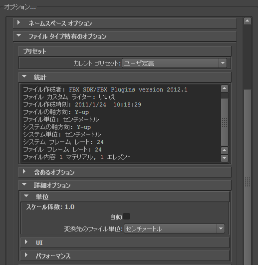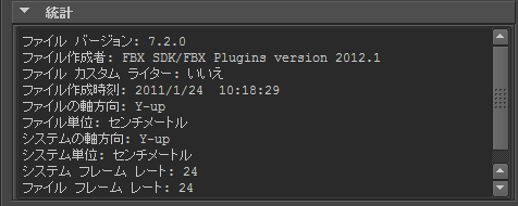 統計(Statistics)ウィンドウには、読み込む FBX ファイルやシステム(アプリケーション)設定の関連メタ情報が表示されます。情報の項目は、ファイルの内容に応じて変化します。統計セクションを使用すると、ファイルが作成された日時、アップ軸面の方向、ファイルで使用している単位設定、フレーム レートなどを確認できます。