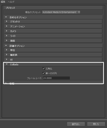 Collada オプションは、書き出す際に、ファイル ブラウザで DAE_FBX ファイル タイプを選択した場合にのみ UI に表示されます。