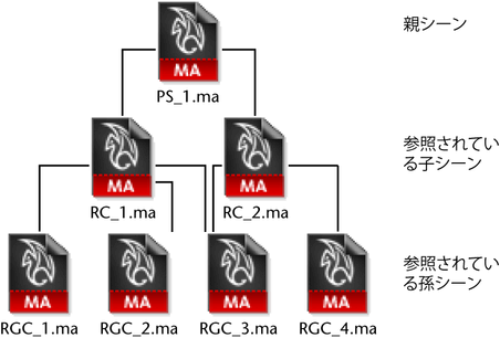 親シーンは、他の親シーンを参照し、ネストされたリファレンスの階層を作成することができます。親シーンは、他のファイルを参照することも、ファイル リファレンス階層内の相対位置に基づいて別の親シーンの子リファレンスになることもできるのです。この場合、その子シーン ファイルは、孫シーン ファイルと呼びます。親シーン、子シーン、および他の孫ファイルを参照するこの階層は、多階層のリファレンスと呼ばれます。