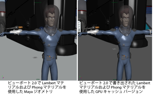 元のジオメトリの Lambert シェーダ マテリアルと Phong シェーダ マテリアルは、GPU キャッシュ ファイルを作成する場合にキャッシュされたオブジェクトと保存することができます。これらのマテリアルは、ビューポート 2.0 でキャッシュが再生されるときにレンダーされます。