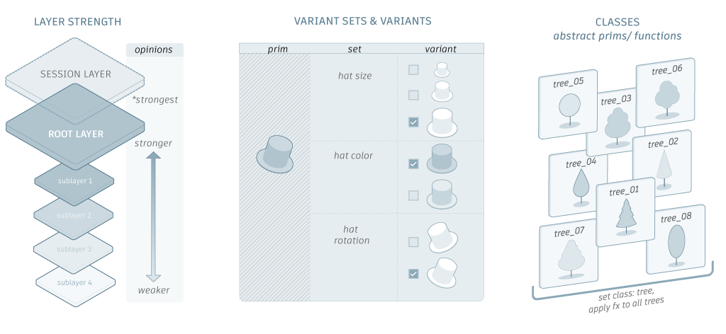 Related Concepts: See references, variant, kind, purpose, layer, layerStack in the Pixar USD Glossary.