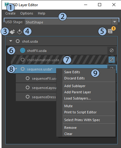 | 9 | USD Layer Editor contextual menu | Right-click a layer to select options from the contextual menu. See USD Layer Editor contextual menu. |