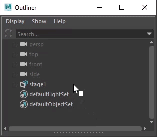 After creating a stage, Maya creates a transform node and a proxyShape node. The proxyShape node points to the USD file and appears in the Outliner. In the following example, stage1 is the transform node and stageShape1 points to the newly created USD stage or proxyShape node.