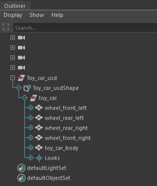 The mixed data model: to distinguish intrinsic Maya data from USD data in the Outliner hierarchy tree, USD data features a unique default data branch color of aqua.