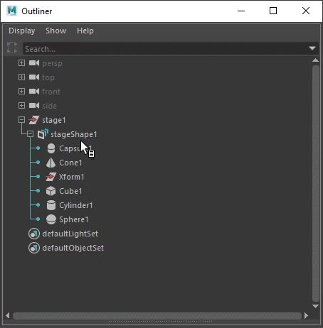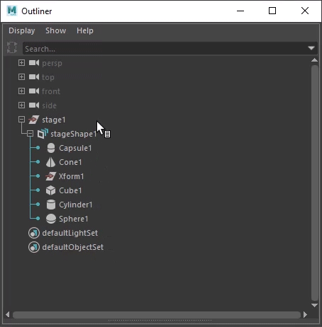 Right-click a node in the Outliner to access USD-specific options in a contextual menu. The content of the menu depends on the type of node you click: the stage transform node, the stage node (proxy shape), or a prim.