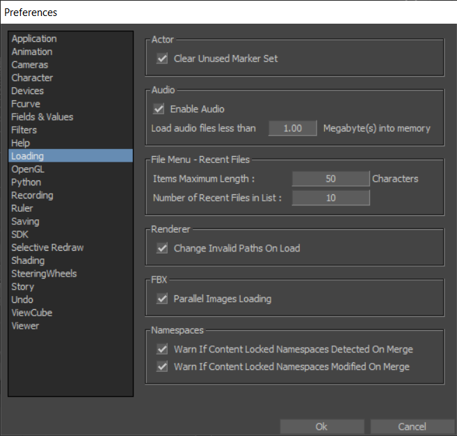 File Menu - Recent Files プリファレンス設定では、最近 MotionBuilder にロードしたファイルに関する既定の設定を行います。次の表では、File Menu プリファレンスの各設定を説明します。