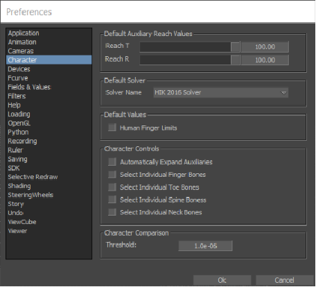 | Automatically Expand Auxiliaries | Character Controls で展開した補助ピボット/エフェクタを表示するには、このオプションをアクティブにします。これにより、個々のエフェクタを選択するたびに展開する必要がなくなります。 |
