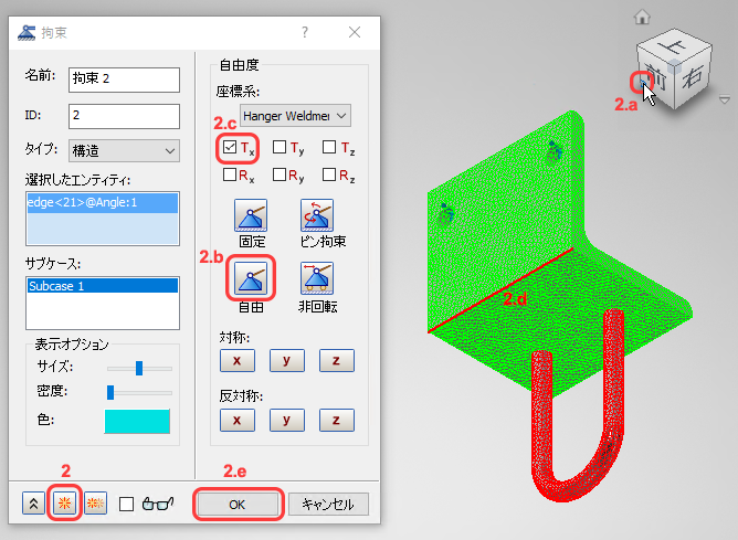 溶接スチール ハンガーは壁にボルトで固定されていますが、その壁はこの CAD モデルやシミュレーション モデルに含まれていません。ハンガーを壁にボルト締結する 2 つの穴のサーフェスを完全に固定してください。さらに、アングル金具の底面外側のコーナーに、X 方向への並進に対抗する拘束を設けてください。この 2 つ目の拘束が壁による支持の働きをします。これにより、荷重適用時にコーナーが –X 方向にずれることを防ぎます。
