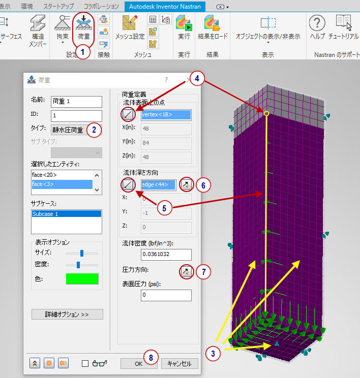 静水圧荷重によって、84 インチの水で満たされたタンクがシミュレーションされます。ジオメトリが分割されているので、水の自由表面上の点を選択できます。
