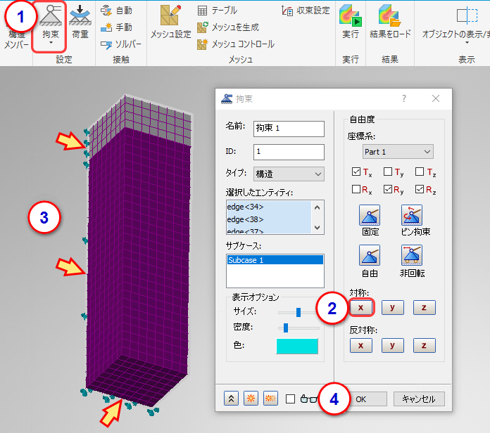 この手順では、YZ 平面で X 対称を対称エッジに割り当てます。
