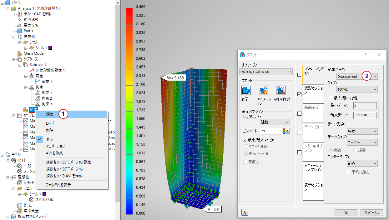 - 解析ツリーの[結果]ブランチで、[変位]を右クリックして、[表示]をクリックします。