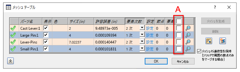 チェックボックス(「A」とマークされている)を使用して、パーツを個別に、あるいは選択的に、メッシュ生成することができます。これは、アセンブリ内のメッシュ生成の問題を見つけるときに非常に役立つツールです。