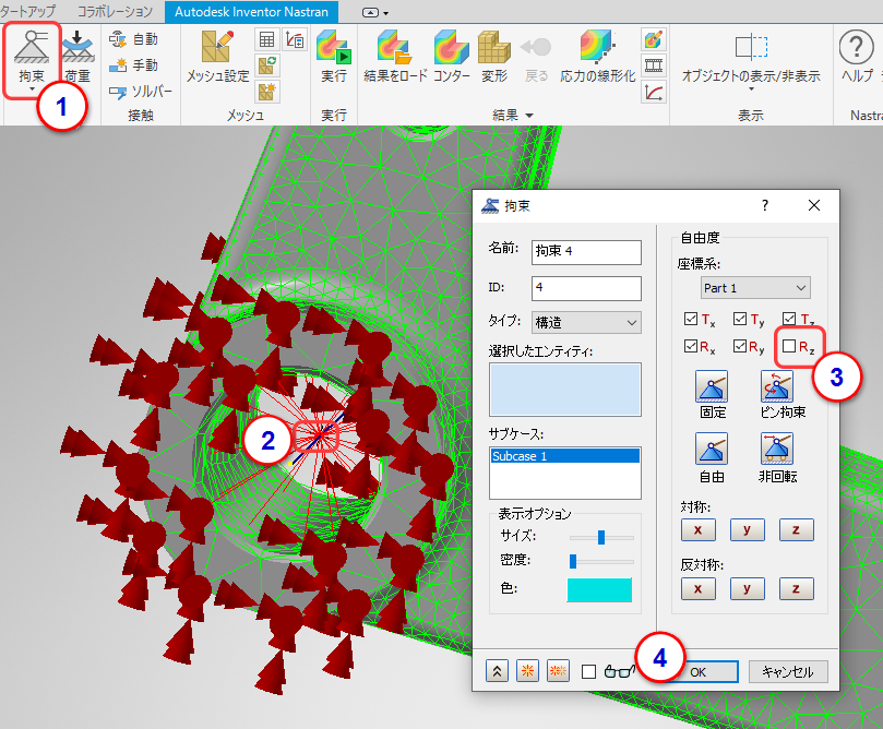 FEA でよく使用される手法は、回転をコントロールするための「ボール ジョイント」拘束です。ボール ジョイント拘束では、剛体要素を使用して基準点をコントロールします。通常、剛体要素はその外観から「スポーク」または「蜘蛛の巣」と呼ばれます。エッジやサーフェスの動きを基準点に結び付けることで、より自然な動きにすることができます。Autodesk Inventor Nastran では、次のように、これを剛体コネクタで行います。