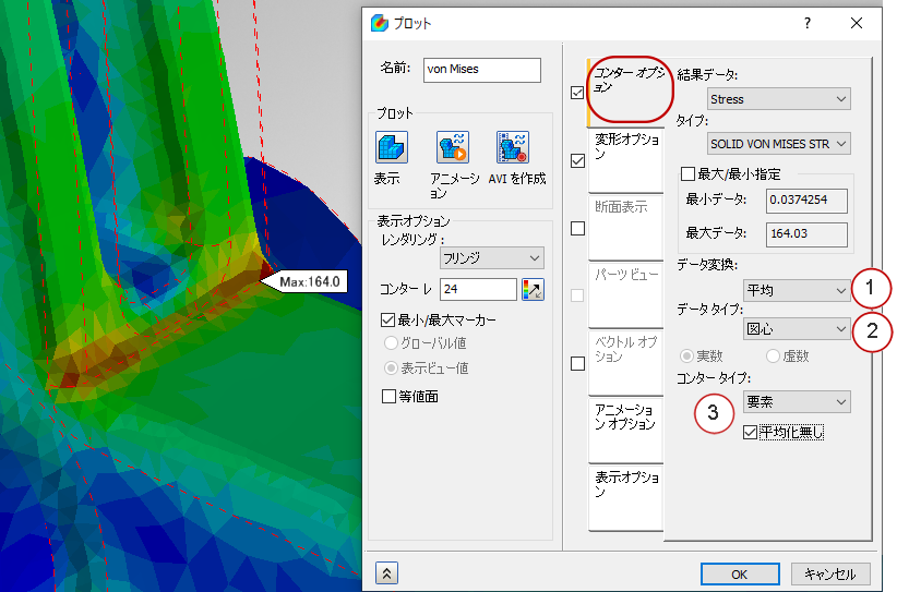 平均化無しの図心タイプのプロットで、応力が隣接する要素を超えて飛び出していることがわかります。これはメッシュの細分割が必要であることを明確に示しています。