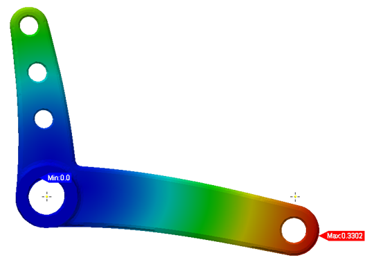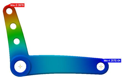 4 番目の演習では、拘束を実際にピンで固定されるパーツに置き換え、対称を使用して剛体運動を拘束し、接触を使用してレバー アームとピンの間の相互作用と動きをモデリングしました。この手法を組み合わせて、物理的に最も現実的な解析シナリオを実現し、次のような変形の結果を得ました。