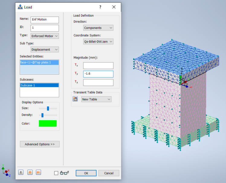 次の手順では、1.6 mm の強制モーション荷重を追加し、上部プレートに対して下向きに 1 秒間適用します。