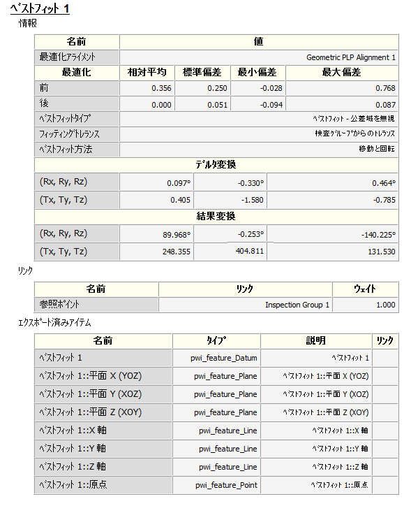 • 計算情報 - ポイントの現行平均、および、標準偏差を表示します。また、計算に使用された移動、および、回転も表示します。