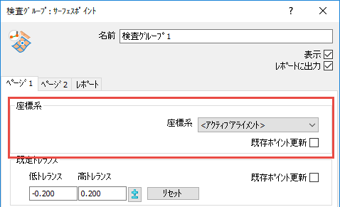 座標系を変更すると、新規アライメントに相対し、グループ内の全ポイントの測定値が再計算されます。PowerInspect が、グループ内の点群を新規アライメントに変換するように設定するには、[既存ポイント更新]チェックボックスを選択します。