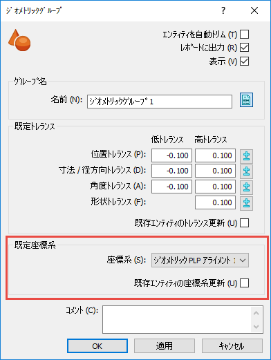 または、対応する グループ のダイアログを開き、座標系リストからアライメントを選択して、ジオメトリックグループに追加された全アイテムに対する既定アライメントを指定します。グループ内の既存アイテムに選択した座標系を適用するには、[既存エンティティの座標系更新]チェックボックスを選択します。