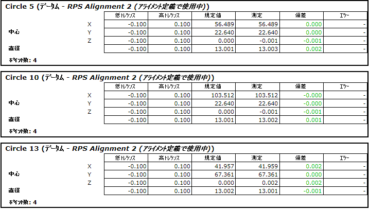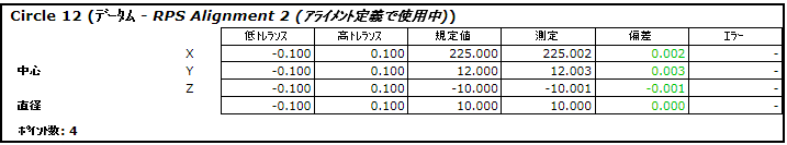 情報 タブ、レポート タブ、RPS アライメント定義 ダイアログには、測定値の標準偏差が表示されます。例: