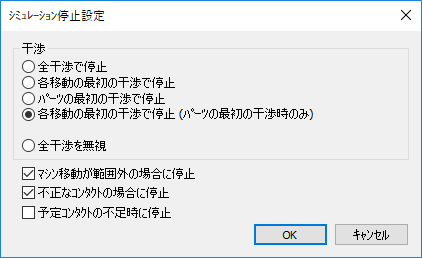 - 全干渉時で停止 - パーツとの干渉の度にエラーメッセージを表示し、シミュレーションを停止します。