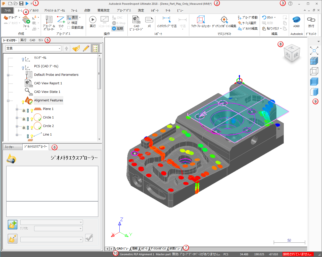 作業する CAD モデルの選択が完了すると、CAD モデルとともに、検査の作成、実行、管理に必要なタブが、PowerInspect の画面に表示されます。例: