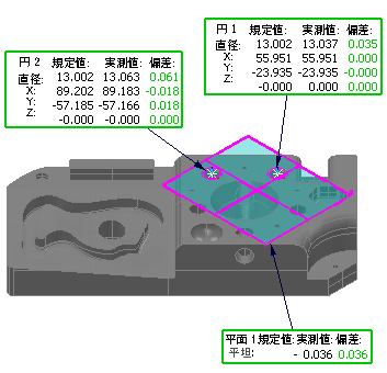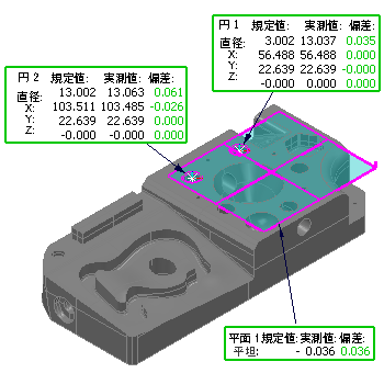 2. 変換マトリックス ダイアログで変換を設定し、OK をクリックします。これにより、規定値、および、測定データが変換されます。また、変換を反映して、CAD ビューが更新されます。