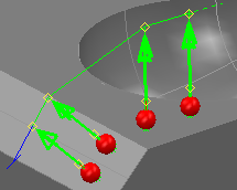 で、フィーチャーの方向沿いに移動して作成されます。または、サーフェス検査グループの最初か最後のポイントを取得し、検査ダイアログで指定された安全高さの距離で、サーフェス検査グループの最初か最後のポイントのベクトル沿いに移動して作成されます。