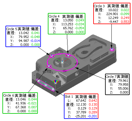 測定ステータスの色は、アイテムラベルの枠にも使用されます。単一アイテムにトレランス上限以上、および、下限以下の測定値が含まれる場合、枠は次図のように複数の色で表示されます。例: