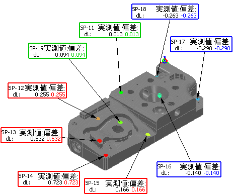 PowerInspect は異なる色を使用して、CAD ビューに表示される各ポイントの測定ステータスを示します。